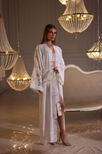 Этот роскошный пеньюар изготовлен из гладкого шелка и украшен изящными вставками из органзы с цветочным рисунком. Элегантный дизайн и нежные детали добавляют образу изысканности и женственности.